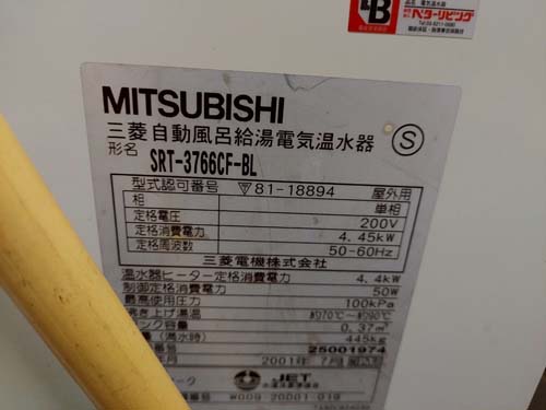 つくば市赤塚 三菱電機自動風呂給湯電気温水器SRT-3766CF-BL→コロナ給湯器 給湯器交換工事
